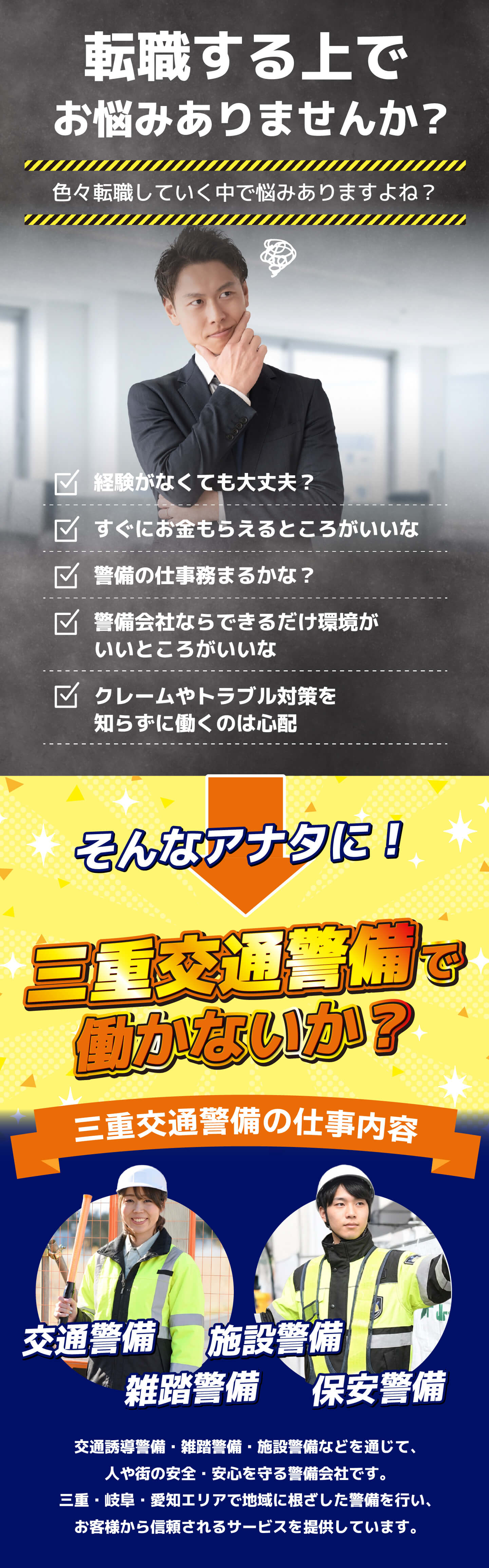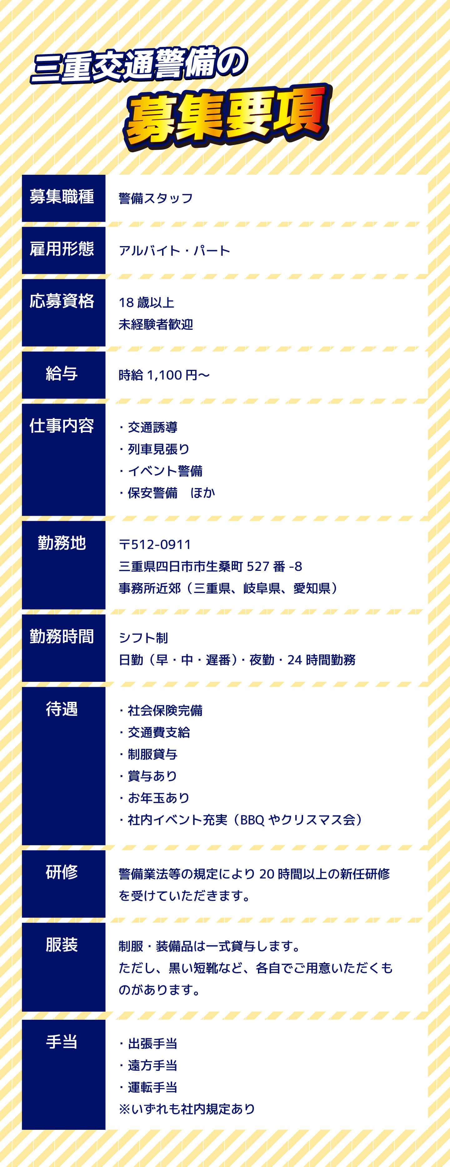 | 事業内容 | 交通誘導警備業務 雑踏警備業務 施設警備業務 |